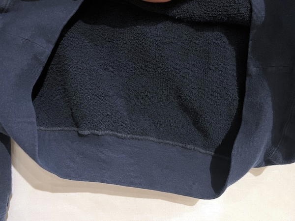 裏毛に使用している糸は、アメリカはニューメキシコ州内のアルバレス農場で栽培されたオーガニックコットンの「落ち綿」使用しています。コシと張りが特徴の糸をゲージギリギリで編み立てとても度の詰まった硬い裏毛を使用しています。