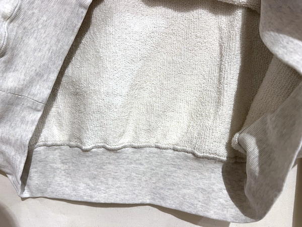 「3飛び裏毛シリーズ」はヴィンテージスウェットに見られる独特の風合いを再現するため、旧式の編み機を用いて製作されています。素材には14番の太い綿糸を使用し、従来のレミレリーフのスウェットよりも重厚感のある見た目ながら、驚くほど軽やかな着心地を実現したシリーズです。