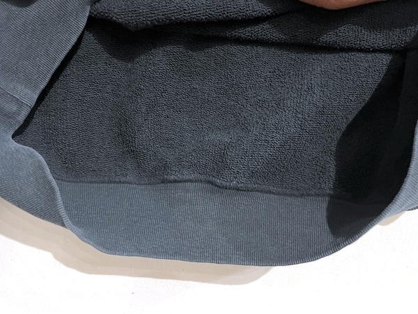 裏毛に使用している糸は、アメリカはニューメキシコ州内のアルバレス農場で栽培されたオーガニックコットンの「落ち綿」使用しています。コシと張りが特徴の糸をゲージギリギリで編み立てとても度の詰まった硬い裏毛を使用しています。