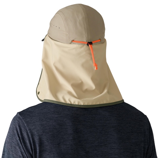 日除け効果を最大限に高めるためにはケープのボタンをあごの前で留めて、適度にカバーしながら風通しをよくするためにはケープのボタンを首の後ろで留めて、通気性を最大限に高めるためには調節可能な後部のストラップにケープを収納して着用できるデザインです。